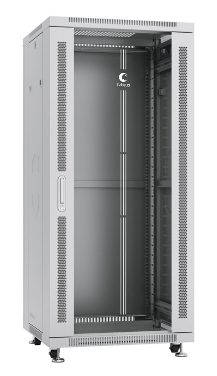 Шкафы CABEUS оптимальное решение для установки кроссового, телекоммуникационного серверного оборудования, стандарта 19 дюймов (19"). Имея современный дизайн, шкафы предназначены для установки и использования внутри помещений. В основе шкафа лежит конструкция из двух сварных рам, что позволяет без труда выдерживать нагрузку до 800 кг. В основание шкафа и в крыше предусмотрены щеточные вводы для защиты оборудования от пыли при вводе информационного и силового кабеля. В шкафу великолепно продумана естественная (пассивная) вентиляция, за счет перфорации в корпусе шкафа и на передней дверце. А так же, конструктивно, предусмотрена установка активной вентиляции. Четыре 19" монтажных L - профиля, имеют юнитовую (U) разметку в соответствии со стандартом DIN 41494-7, глубина установки направляющих может изменяться в зависимости от устанавливаемого оборудования. Две съемные боковые панели – обеспечивают удобный доступ к установленному оборудованию. Фиксация боковых панелей, осуществляется при помощи защелок.