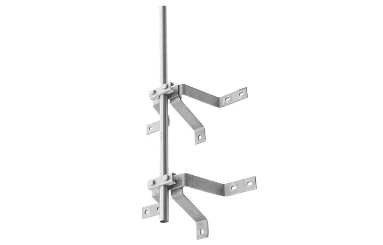 Крепление (поставляется набор из двух единиц) позволяет установить стержневой молниеприёмник (мачту) ZZ-201-004 на дымоходе или воздуховоде. Крепление фиксируется десятью анкерами (по пять на каждый), что обеспечивает очень высокую механическую прочность конструкции. Изготовлен из нержавеющей стали. Болты, шайбы и гайки выполнены из нержавеющей стали.