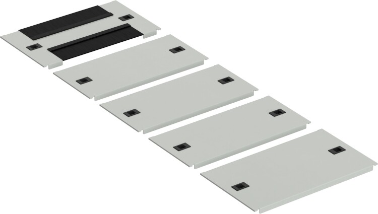 Используется для изолирования пространства в нижней части шкафа. Предотвращают попадание пыли во внутренне пространства шкафа а также повышают эффективность систем принудительного охлаждения. Элементы панели оснащены подпружиненными замками, что обеспечивает их простой и удобный монтаж без использования инструментов. Один из модулей панели оснащен щеточными вводами с суммарным окном просвета 480 см², при необходимости увеличения емкости кабельного ввода имеется возможность замены любого глухого модуля панели на модуль с щеточным вводом. Монтаж панели основания возможем уже после ввода кабеля в шкаф.