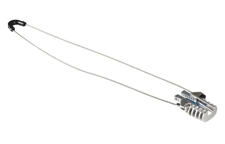 Предназначен для крепления и поддержки кабеля с обеспечением требуемого натяжения кабельной линии. Состоит из открытого конического корпуса, пары металлических зубчатых клиньев (зажимное устройство) и гибкой петли. Все детали соединены между собой и не могут быть утеряны. Устанавливается парами в начале, конце и в интервале 5-ти опор по протяженности кабельной линии. Обеспечивает значительное сокращение продолжительности процесса подвес кабеля.