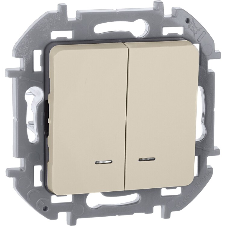 Выключатель двухклавишный с подсветкой/индикацией скрытого монтажа Inspiria, цвет "Слоновая кость", номинальный ток 10АХ, напряжение ~250В, безвинтовые зажимы. Устанавливается в жилых и общественных помещениях для управления приборами освещения, вентиляции и т.д. Предназначен для управления двумя электрическими цепями.