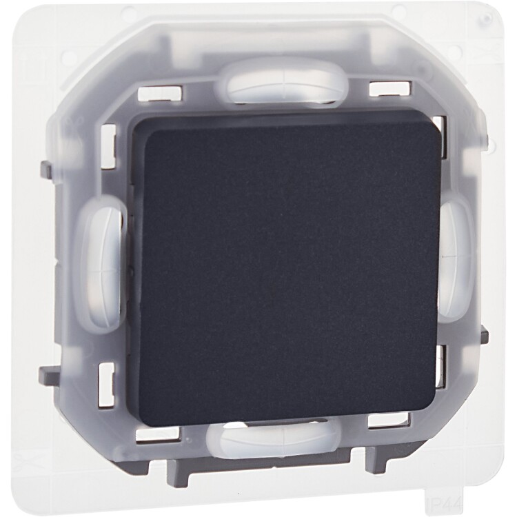 Переключатель одноклавишный IP44 скрытого монтажа Inspiria, цвет "Антрацит", номинальный ток 10АХ, напряжение ~250В, безвинтовые зажимы. Устанавливается в жилых и общественных помещениях для управления приборами освещения, вентиляции и т.д. Предназначен для установки в местах с повышенной влажностью (например, ванные комнаты, веранды, кладовки, подвалы, коридоры и т.п.) и используется для управления нагрузкой с одного, двух или более мест (совместно с перекрёстными переключателями).