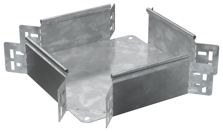 Крестовина предназначен для организации X-образного разветвления кабельной трассы в горизонтальной плоскости. Стыковка аксессуара с лотком осуществляется за счёт телескопического соединителя. Подходит для всех типов листовых лотков серии ESCA. Крышка на аксессуар заказывается отдельно. Аксессуар изготовлен из стали оцинкованной методом горячего погружения (защитный слой цинка не менее 55 мкм).