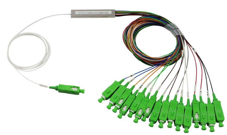 Оптические PLC сплиттеры предназначены для разделения одного входного сигнала на несколько выходных или объединения нескольких сигналов в один. PLC сплиттеры производят посредством нанесения диоксида кремния (волноводного слоя) на подложку из кремня, вследствие чего образуется кристалл, к которому затем приваривается ленточное волокно. Благодаря этой технологии делители объединяют в себе широкую полосу пропускания, которая равномерно охватывает весь рабочий диапазон длин волн, высокую надежность и стабильность работы, даже при неблагоприятных внешних условиях, небольшие размеры. У делителя P-304 один кабель находится на входе и восемь на выходе. Все кабели оконцованы коннекторами SC/APC. Микрокорпус представляет собой металлическую трубку прямоугольного сечения размером 60х7х4 мм. В делителе PLC используется кабель с диаметром 0,9 мм и длиной 0,5м.
