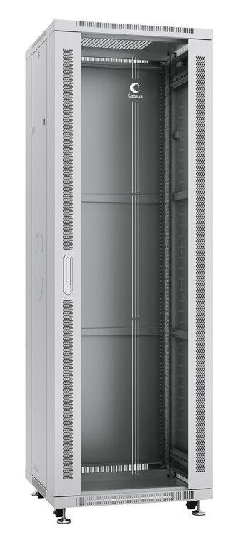 Шкафы CABEUS оптимальное решение для установки кроссового, телекоммуникационного серверного оборудования, стандарта 19 дюймов (19"). Имея современный дизайн, шкафы предназначены для установки и использования внутри помещений. В основе шкафа лежит конструкция из двух сварных рам, что позволяет без труда выдерживать нагрузку до 800 кг. В основание шкафа и в крыше предусмотрены щеточные вводы для защиты оборудования от пыли при вводе информационного и силового кабеля. В шкафу великолепно продумана естественная (пассивная) вентиляция, за счет перфорации в корпусе шкафа и на передней дверце. А так же, конструктивно, предусмотрена установка активной вентиляции. Четыре 19" монтажных L - профиля, имеют юнитовую (U) разметку в соответствии со стандартом DIN 41494-7, глубина установки направляющих может изменяться в зависимости от устанавливаемого оборудования. Две съемные боковые панели – обеспечивают удобный доступ к установленному оборудованию. Фиксация боковых панелей, осуществляется при помощи защелок.