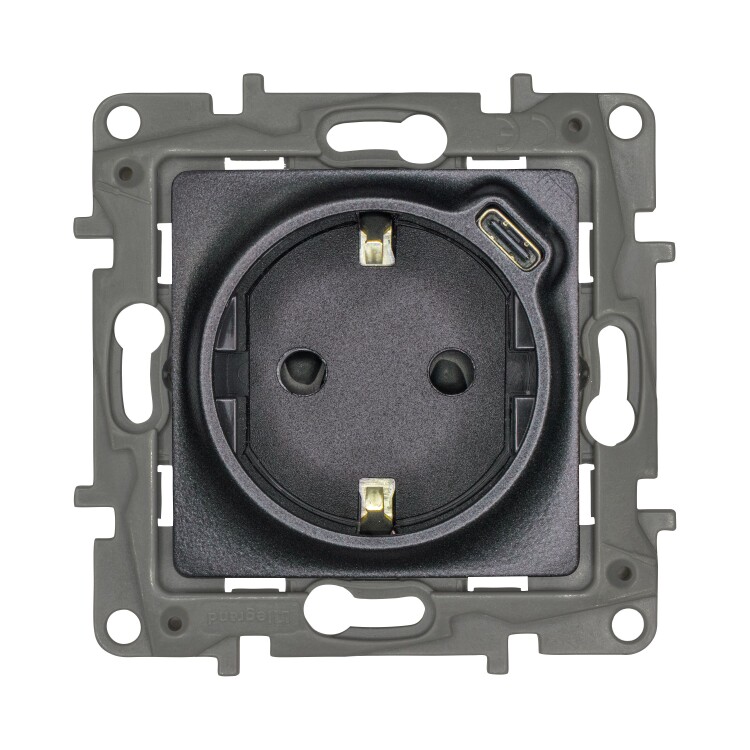 Розетка 1-местная ETIKA с заземлением с защитными шторками с USB C. Применяется для одновременного электропитания бытовых потребителей и зарядки мобильного устройства. Оснащена интегрированными шторками, которые защищают детей и других пользователей от удара электрическим током.