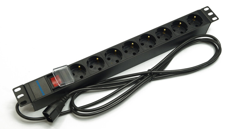 Блок розеток 19", 1U, 8 гнёзд (Schuko), вход C14, 10A, с LED выкл., черн., каб. 2,5м, DANNMAN 7000380